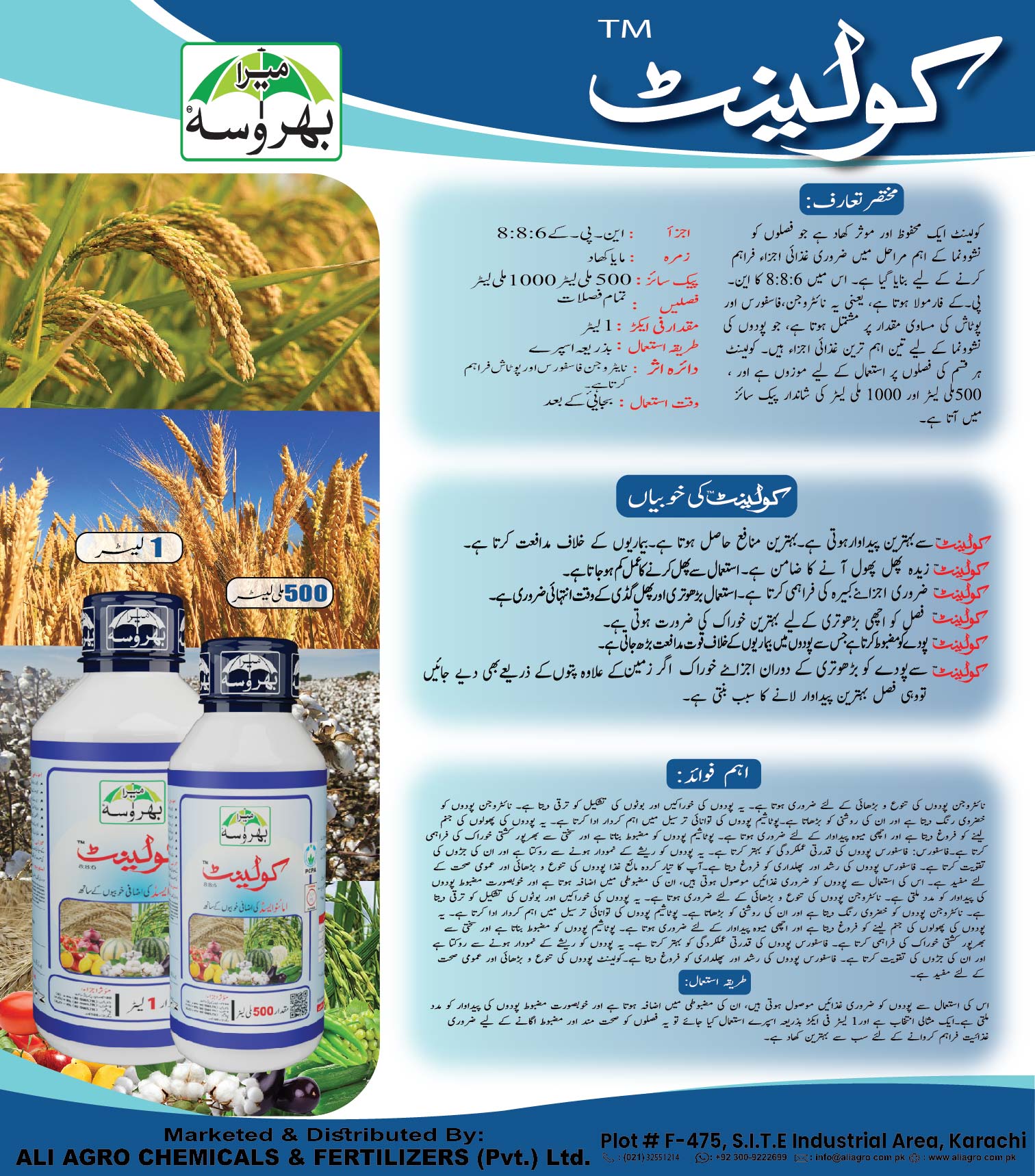 کولینٹ ایک محفوظ اور موثر کھاد ہے جو فصلوں کو نشوونما کے اہم مراحل میں ضروری غذائی اجزاء فراہم کرنے کے لیے بنایا گیا ہے۔ اس میں ۸:۸:۶ کا این۔ پی۔کے فارمولا ہوتا ہے، یعنی یہ نائٹروجن،فاسفورس اور پوٹاش کی مساوی مقدار پر مشتمل ہوتا ہے، جو پودوں کی نشوونما کے لیے تین اہم ترین غذائی اجزاء ہیں۔ کولینٹ ہر قسم کی فصلوں پر استعمال کے لیے موزوں ہے اور ، ۵۰۰ملی لیٹر اور ۱۰۰۰ ملی لیٹر کی شاندار پیک سائز میں آتا ہے۔