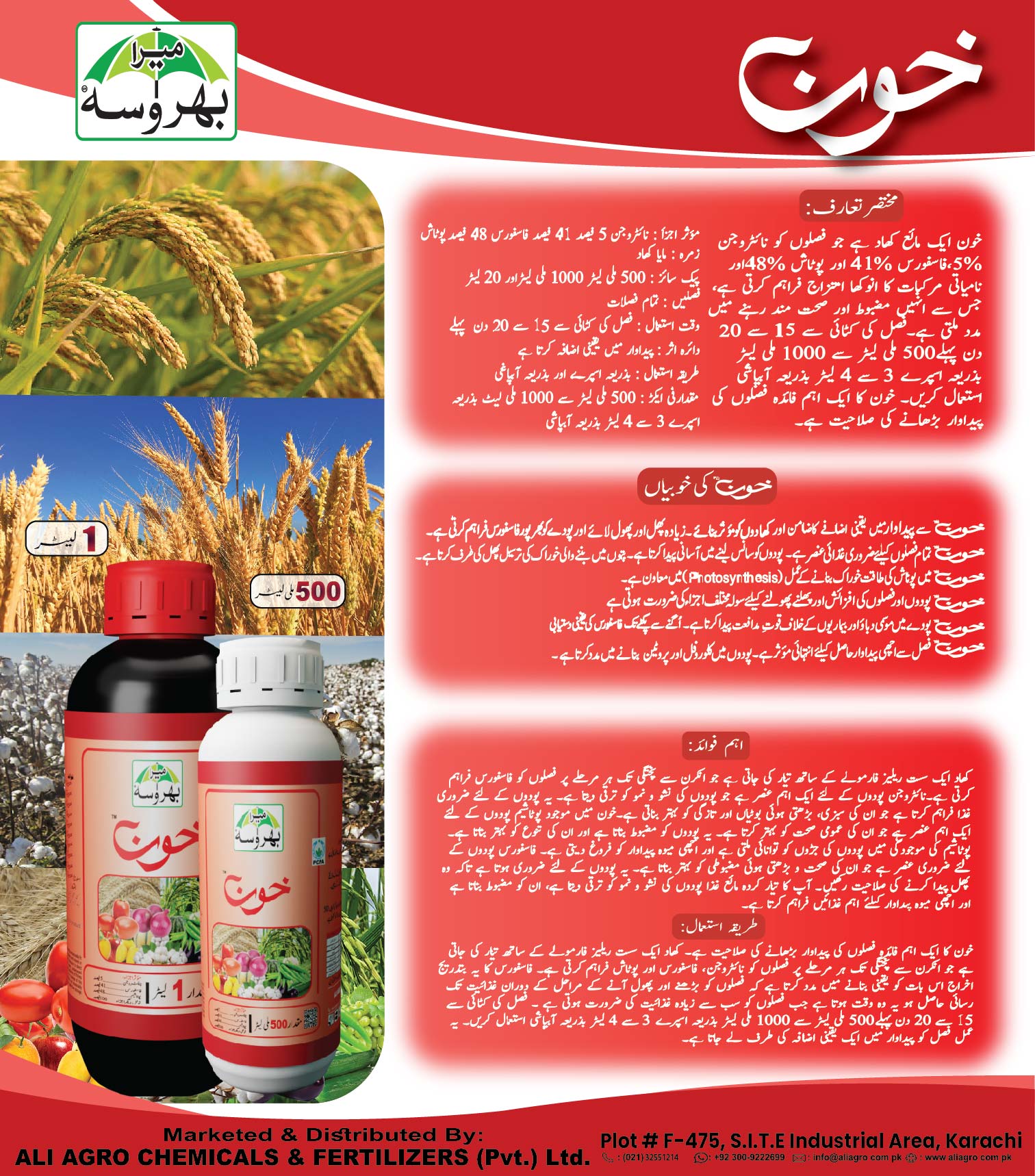 Khoon is a Nutrient Fertilizer containing 5% Nitrogen, 41% Phosphorus, and 48% Potassium. It is suitable for all types of crops. Apply it through both spray and irrigation methods, starting 15 to 20 days before the crop is harvested.