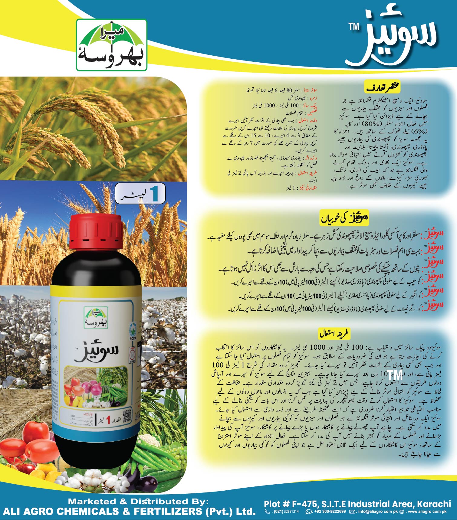 سووئیز ایک وسیع اسپیکٹرم فنگسائڈ ہے جو فصلوں اور سبزیوں کو مختلف بیماریوں سے بچانے کے لیے ڈیزائن کیا گیا ہے۔ سوئیز میں فعال اجزاء سلفر (80%) اور کاپر (6%) نیلے تھوک کے ساتھ ہیں۔ اجزاء کا یہ مجموعہ سویز کو پھپھوندی کی بیماریوں جیسے پاؤڈری پھپھوندی، اگیتا پچیتا، بلائیٹ اور پھپھوندی کو کنٹرول کرنے میں انتہائی موثر بناتا ہے۔ سوئیز ایک نظامی اور روک تھام کرنے والی فنگسائڈ ہے جو کہ سیب کی الرجی، زنگ، بھوری سڑ، کیڑے، پتوں کے داغ اور پسو ہاپر جیسے کیڑوں کے خلاف بھی موثر ہے۔